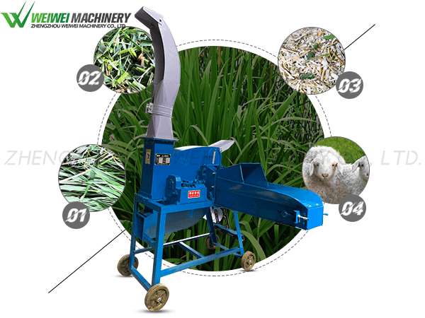 用于切割青(干)草、玉米秸稈、秸稈和其他農作物秸稈及飼料的機器,由電機作為支撐動力,將動力傳遞到主軸上,主軸齒輪的另一端通過齒輪箱、萬向節等將動力傳遞的速度傳遞到壓輥上,當物料進入被加工的上下壓輥時,握住并以一定速度進入切割機構,高速旋轉切割機切割后,草被卸料口拋出機器。